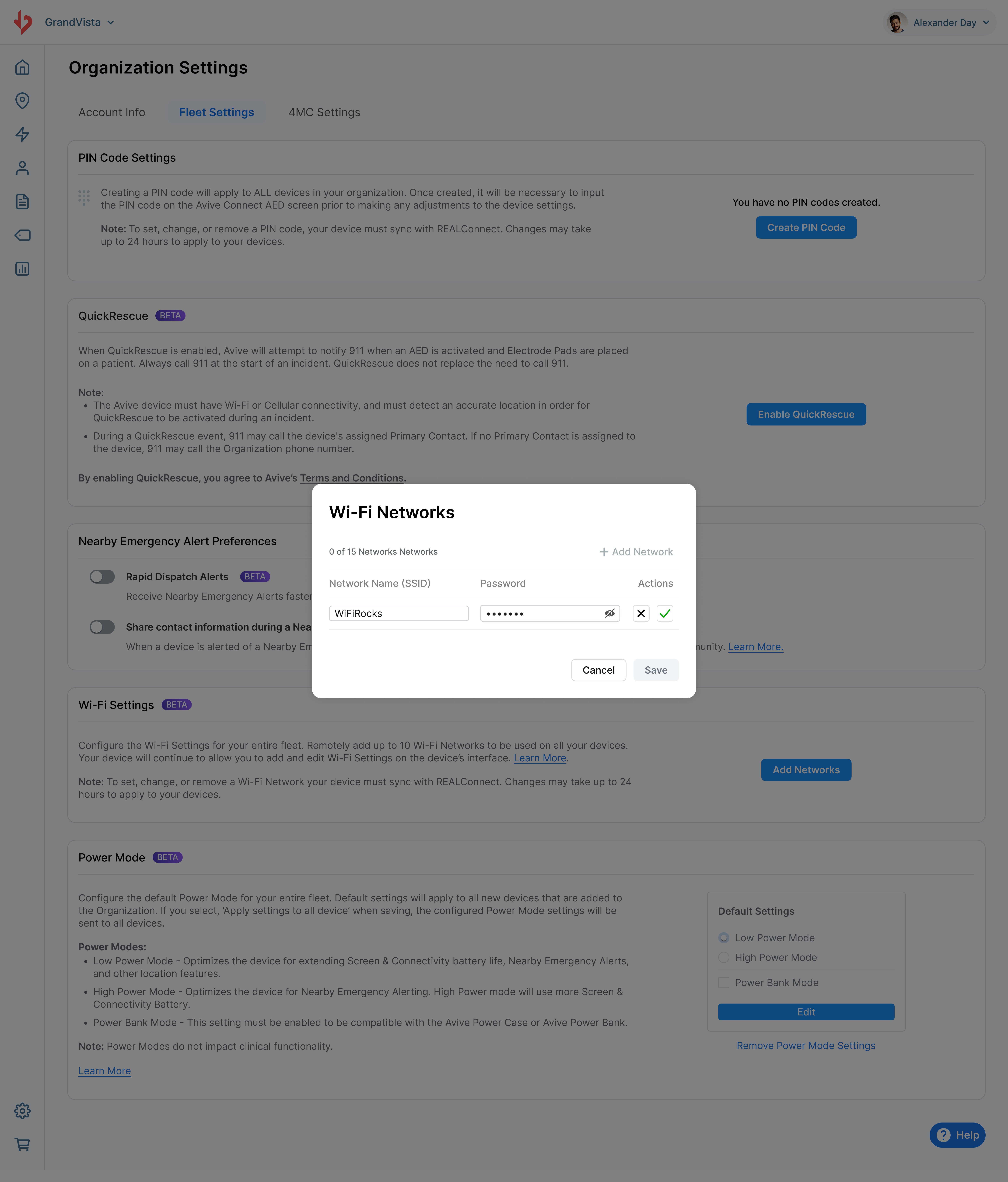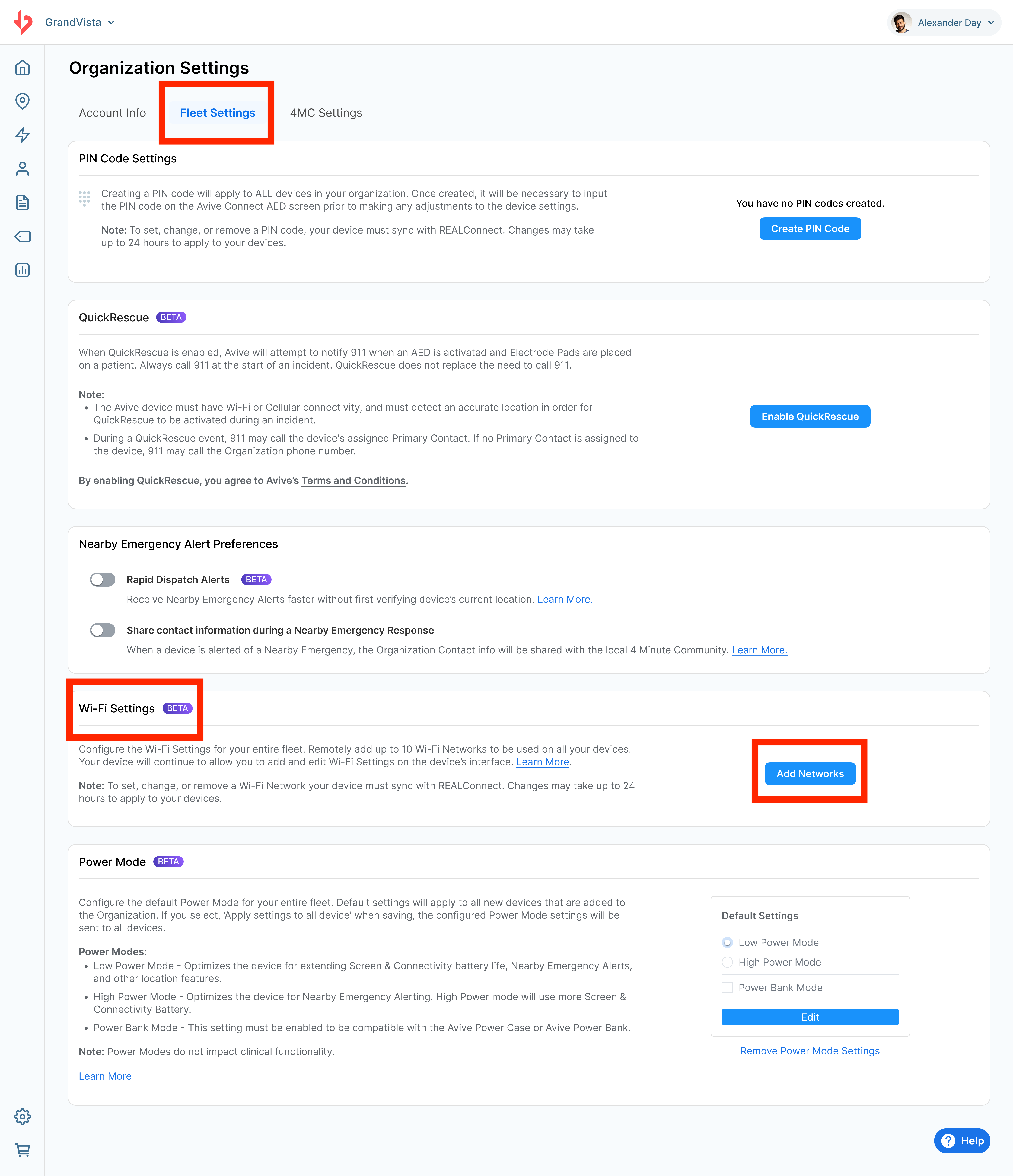 Each Avive Connect AED comes with cellular, GPS, and Wi-Fi connectivity. Adding a Wi-Fi network is a good practice since it will allow you to access the device's full feature set, including enhanced location information and a better battery life.