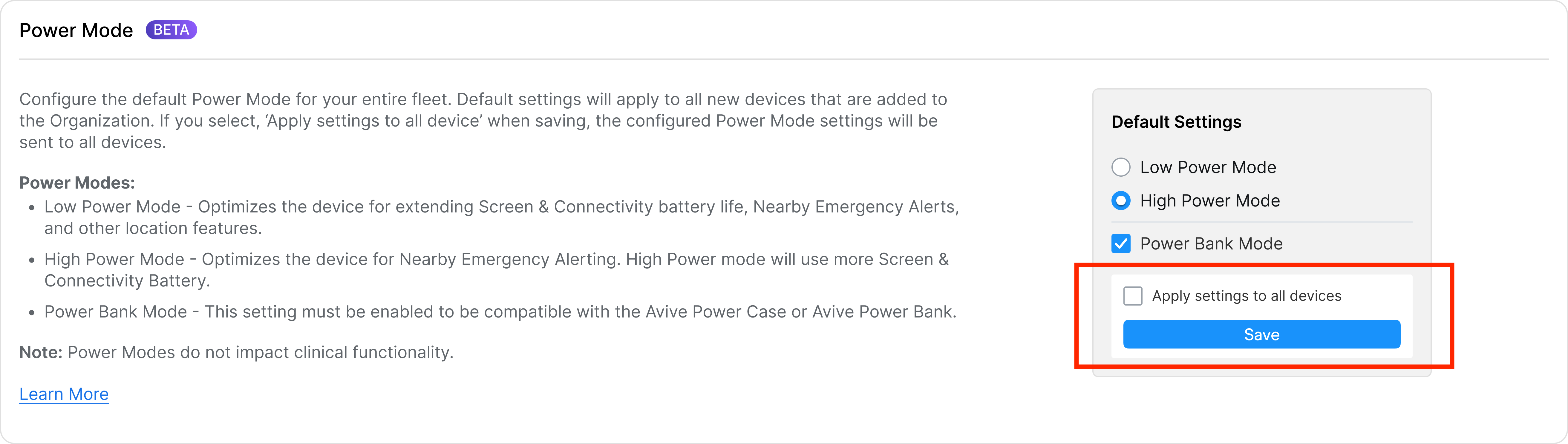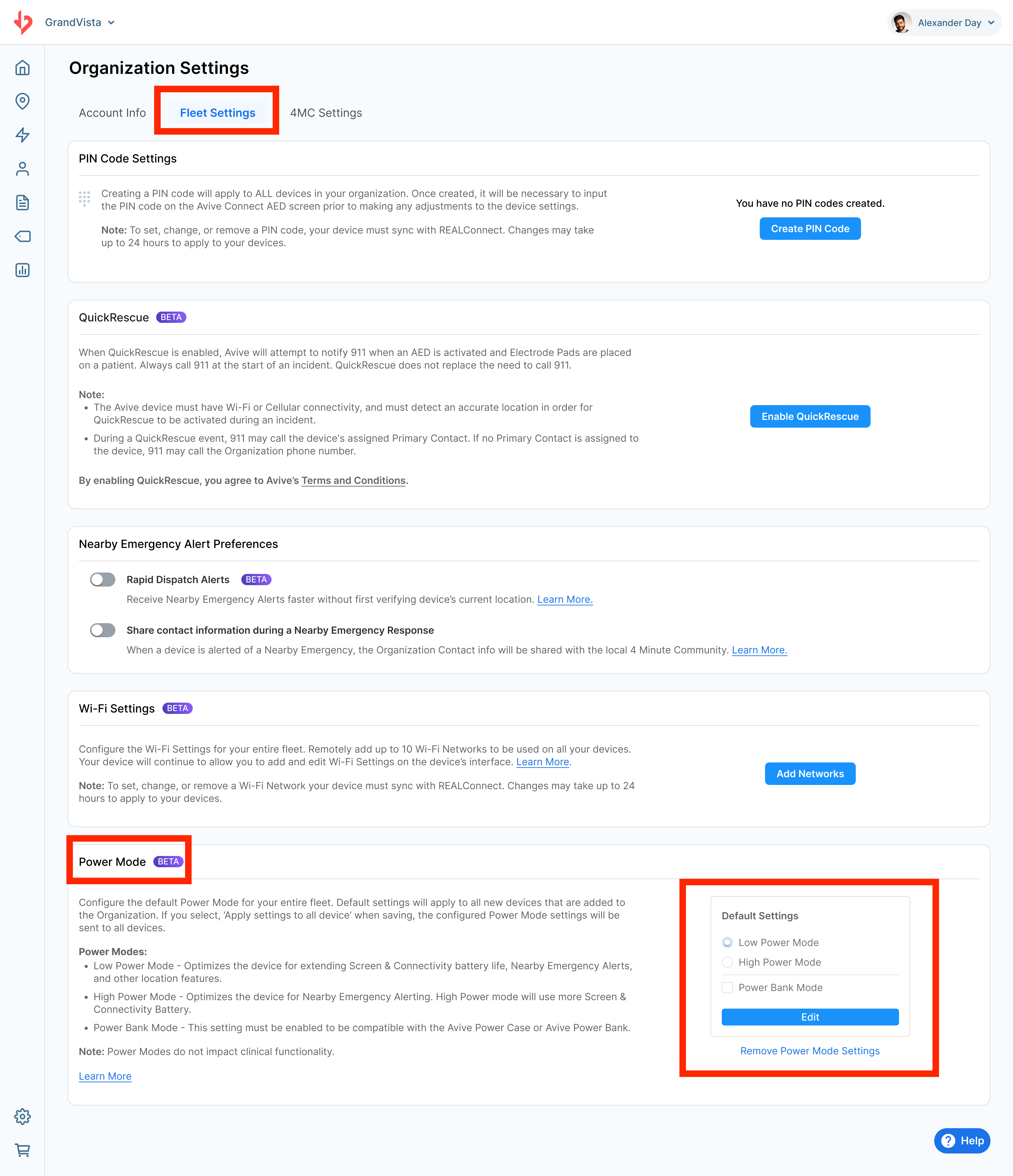 Step 2: Click the blue “Edit” button, and make your selection. Check the “Apply settings to all devices” box to send the Power Mode to all AEDs in your fleet. Leaving this box unchecked means the setting applies only to new devices added to your organization.