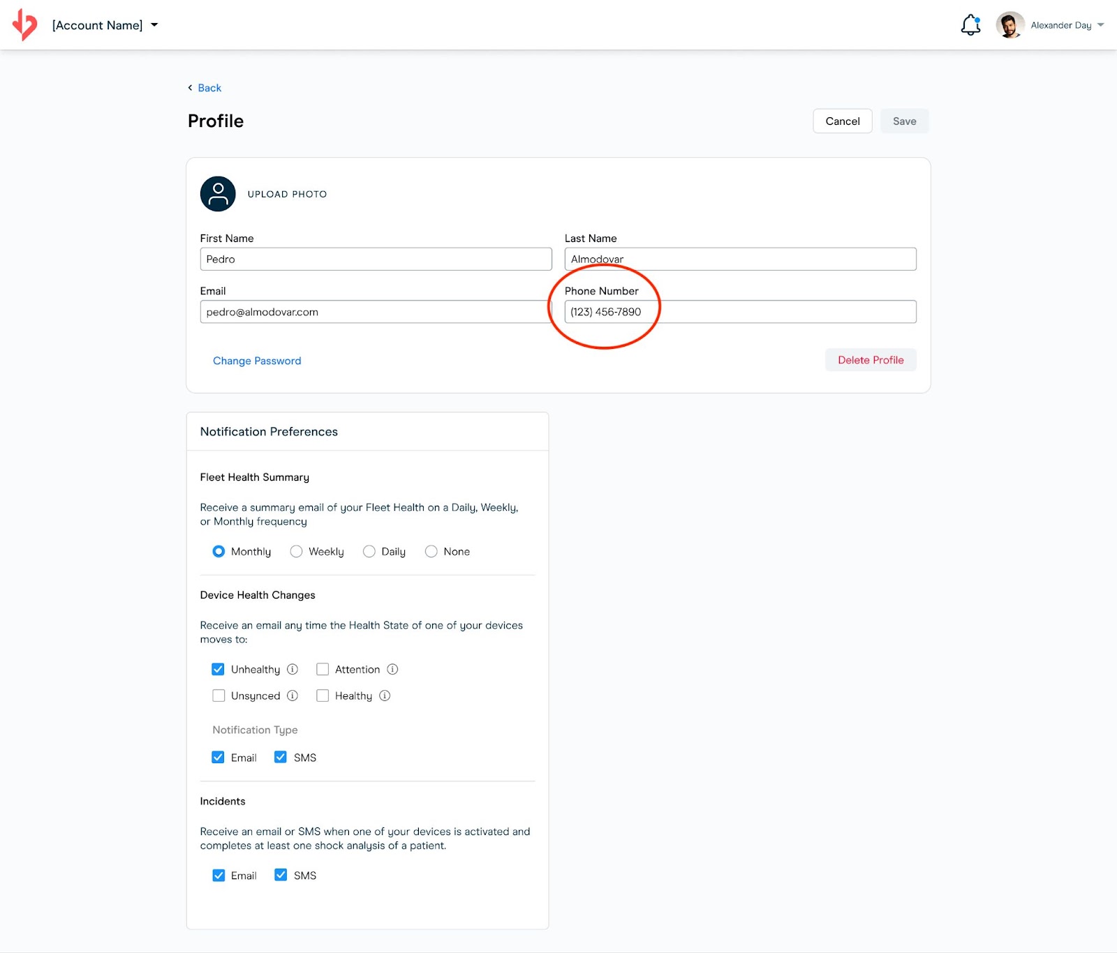 To change the phone number at which you receive AED Health State Change or Incident Notifications, navigate to your Profile page in REALConnect.